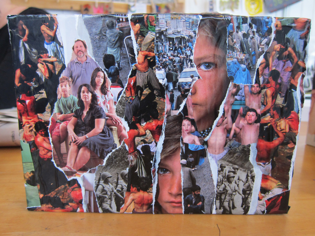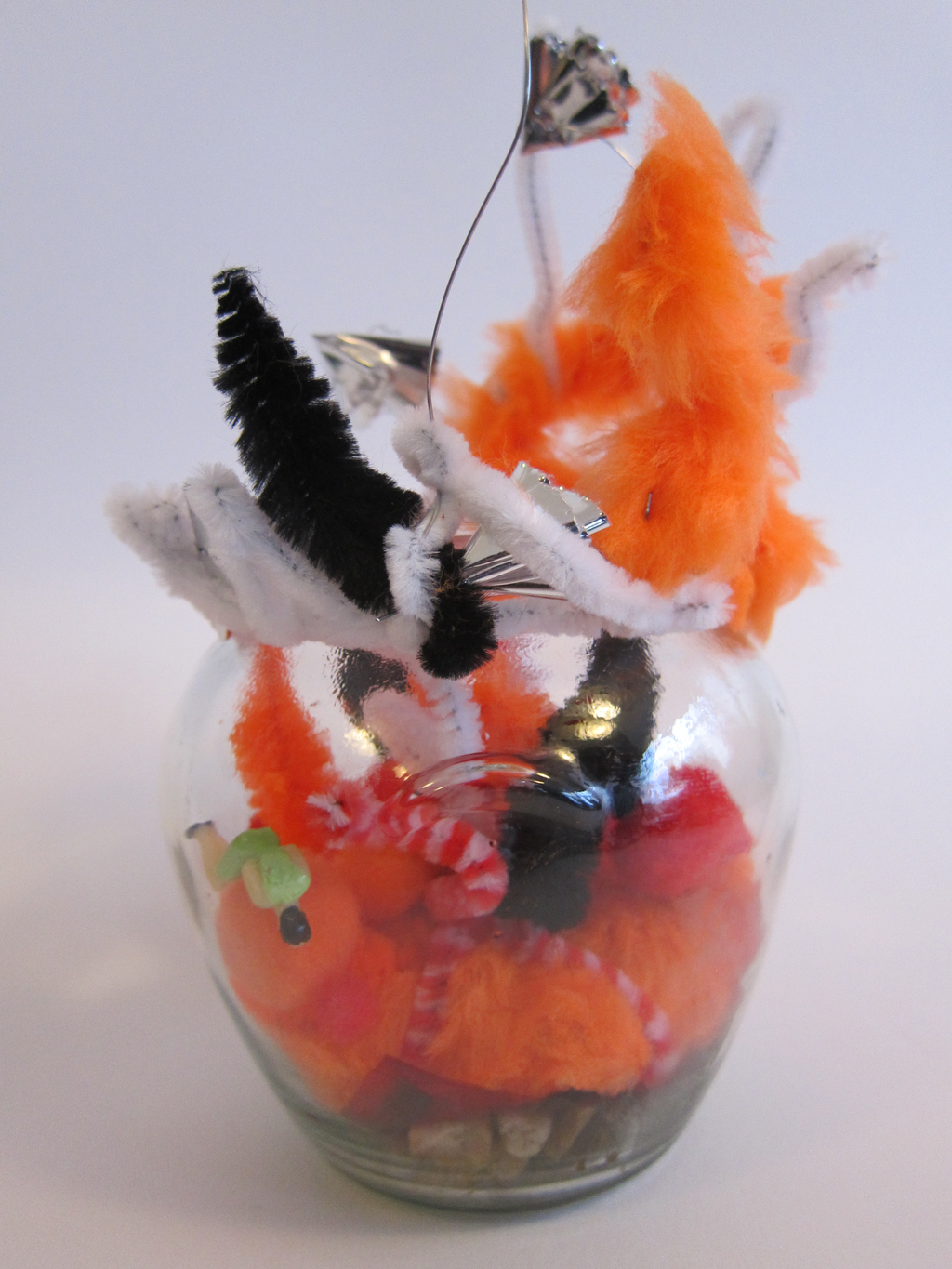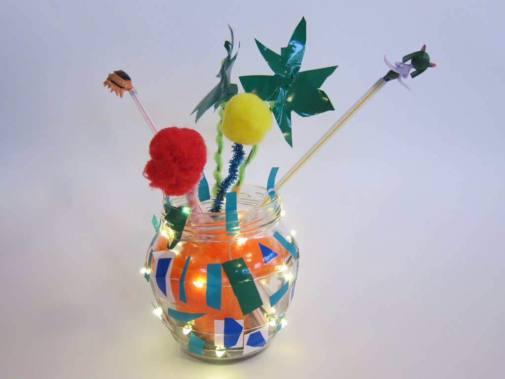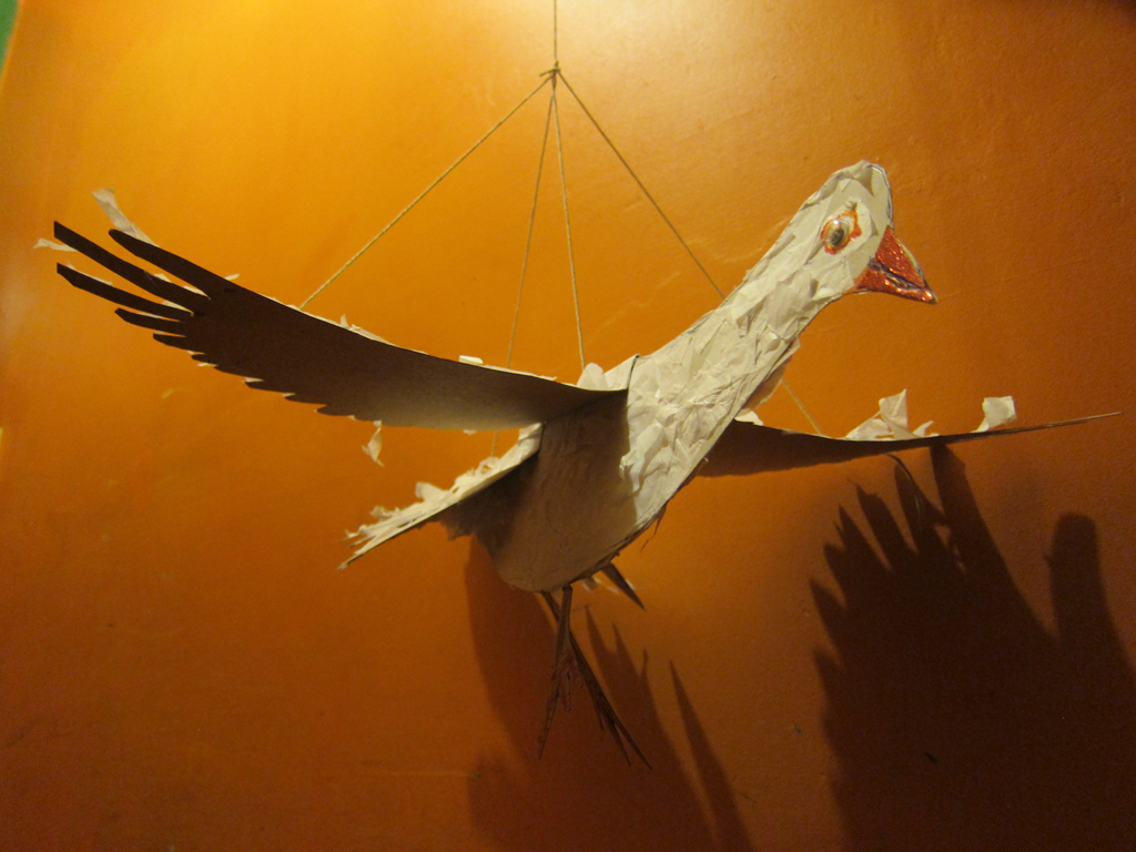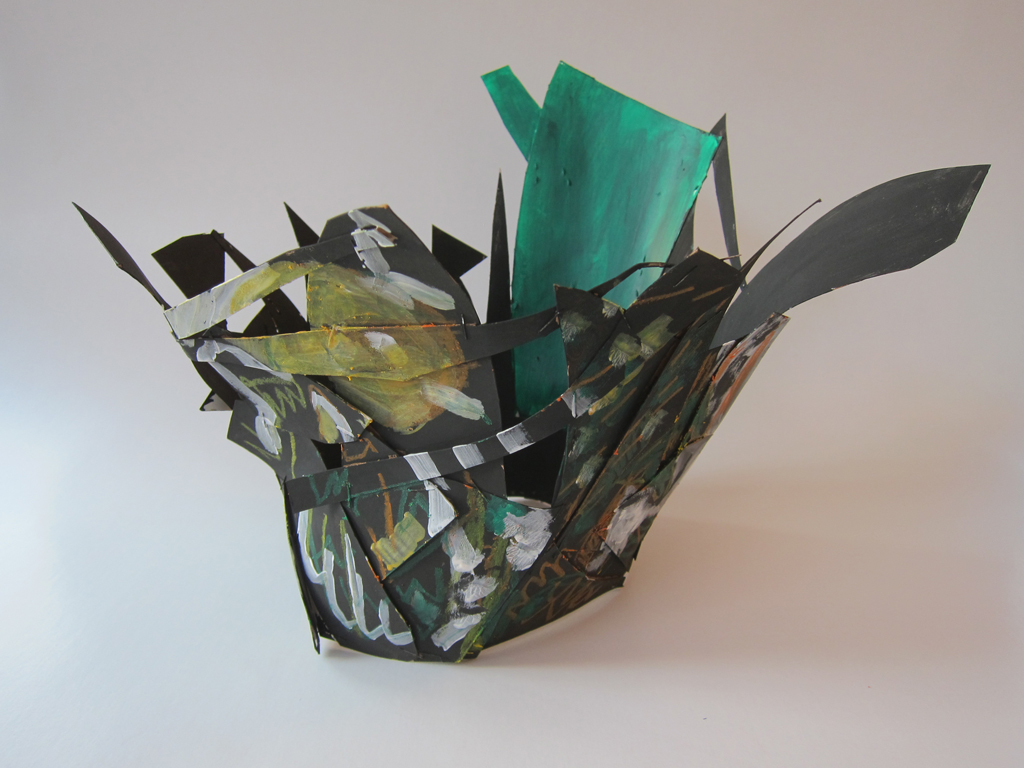 Here are a selection of some of the 3D and sculptural work people have made in sessions. We have made shrines from tin cans, fantasy gardens in jars, constructions from newspaper and wire, sculptures from wire and netting, festival headgear, bird mobiles, trash Christmas decorations and decorated recycled boxes.